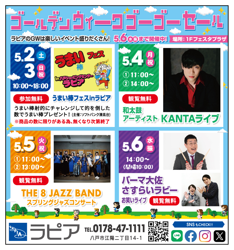 イベント 【GWは楽しいイベント盛りだくさん!】2026年5月2日(土)~6日(水振) お知らせ 【BullPulu 八戸ラピア店 2/27OPEN 期間限定メニュー販売中!】 イベント 【京都味の市】2026年4月18日(土)~27日(月) 10:00~19:00 ※最終日17:00終了 イベント 【アベシステム 超大型補助金相談会】2026年4月25日(土)~26日(日) 10:00~15:00 ファッション 服飾雑貨 生活用品 食品 サービス グルメ Facebookもチェック 八戸ショッピングセンター ラピア San-ai Resort northerly / サンアイリゾート ノーザリー 掲載日:2026.04.18 パールリボンレースモールド💄 幸楽苑 掲載日:2026.04.18 季節を先取り!幸楽苑の冷やし麺 Be Stone / ビーストーン 掲載日:2026.04.18 マンサーノ翡翠🌹 八戸ワールドコンタクト ラピア店 掲載日:2026.04.18 2weekクレシェ新色のご紹介😆 エステール 掲載日:2026.04.18 母の日~「ありがとう」をカタチに~ エステール 掲載日:2026.04.14 As-me RULE Be Stone / ビーストーン 掲載日:2026.04.10 ガーデンアメシスト(庭園紫水晶)のブレスレット販売中‼️ San-ai Resort northerly / サンアイリゾート ノーザリー 掲載日:2026.04.10 新作ブラセット入荷✨ ソフィ マエバラ 掲載日:2026.04.10 蛇をあなたの人生のお供にいかがですか?^^