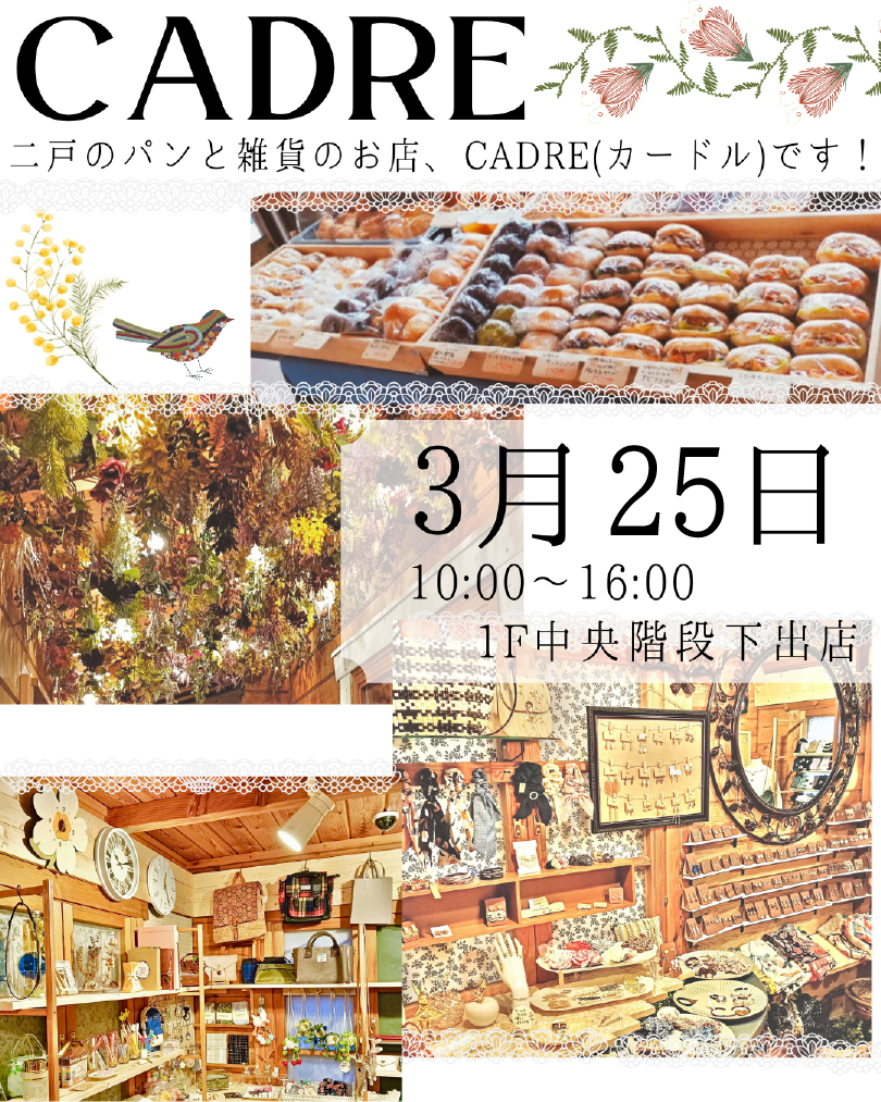 ファッション 12 服飾雑貨 7 生活用品 15 食品 7 サービス 20 グルメ 15 Facebookもチェック 八戸ショッピングセンター ラピア イベント お知らせ イベント event イベント B1F ラピアホール 【確定申告書作成会場】2026年2月16日(月)~3月16日(月) 9:00~16:00 イベント 1F 中央階段下 【里いちみ 雪室りんご販売会】2026年3月14日(土)~15日(日) 10:00~17:00 イベント 1F フェスタプラザ 【ウイッグユキ展示会】2026年3月17日(火) 10:00~16:00 約400種類の豊富なウィッグの中からお気軽にご試着いただけます。 あなたに似合う素敵なウィッグを是非お選び下さい。 イベント 1F 中央階段下 【ごはん処おかふぇ お弁当&お惣菜販売】2026年3月18日(水) 11:30~売り切れ次第終了 イベント 1F ファッションストリート入口 【しごと発見!お仕事相談会】2026年3月18日(水)~19日(木) 10:00~18:00 イベント 1F パセリー菜となり 【石橋煎餅 南部せんべい販売】2026年3月20日(金祝)~22日(日) 10:00~18:00 イベント 1F 中央階段下 【CADRE パン販売】2026年3月25日(水) 10:00~16:00 イベント 1F フェスタプラザ 【青潮子どもえんぶり部】2026年3月28日(土) 11:00~ イベント 1F フェスタプラザ 【Acceletta 歌と奏~つながり~】2026年3月29日(日) ①11:00~ ②14:00~ イベント 1F フェスタプラザ 【フォレストホームサービス ポムポムプリンスタンプラリー】2026年4月4日(土)~5日(日) 10:00~18:15 1 / 212»