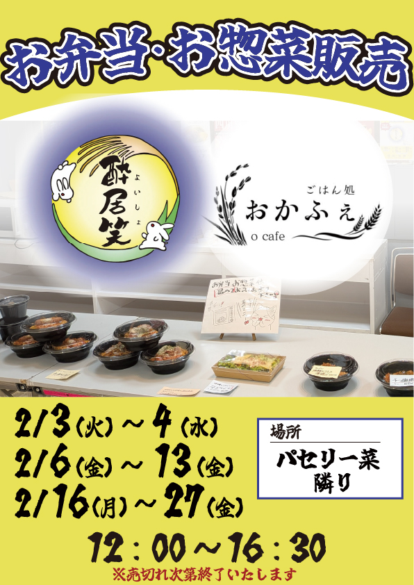 【酔居笑×おかふぇ お弁当&お惣菜販売】2026年2月3日(火)~4日(水)/6日(金)~13日(金)/16日(月)~27日(金) 12:00~16:30 ※売切れ次第終了