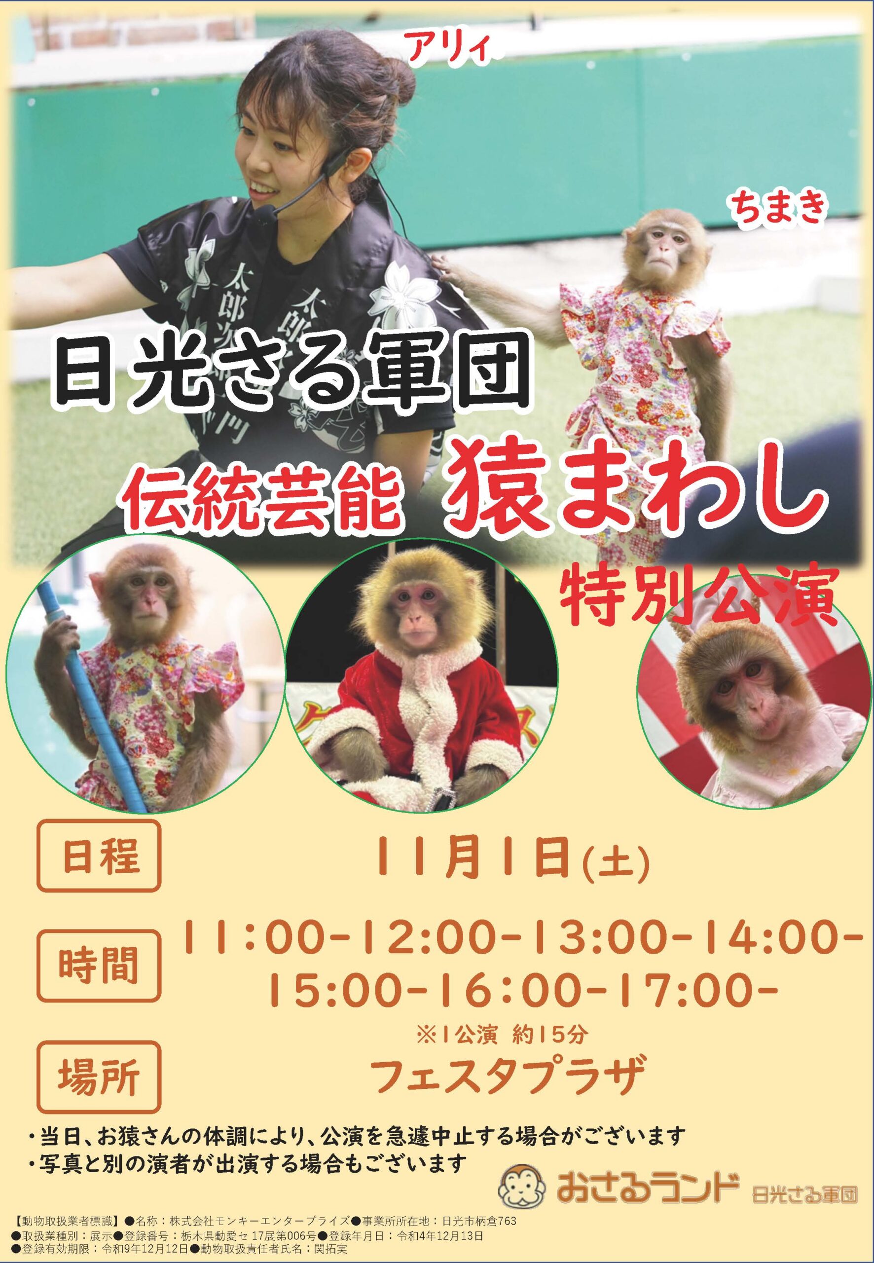 【伝統芸能 猿まわし特別公演】2025年11月1日(土) 11:00~17:00※1時間ごとに1公演(約15分)