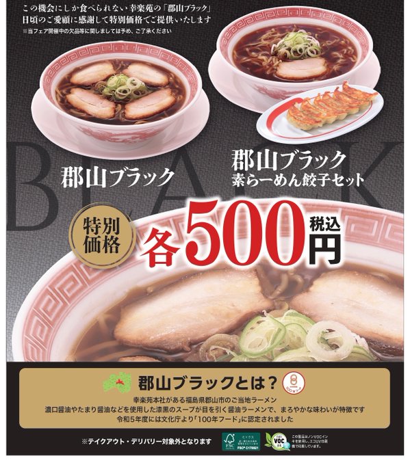 3階幸楽苑からお知らせです。■予告! 郡山ブラックフェア 3/2(月)~4(水)開催 毎回多くのお客様からご好評いただいております 期間中はぜひ、幸楽苑をご利用ください 郡山ブラック 500円(税込) 郡山ブラック素らーめん餃子セット 500円(税込)