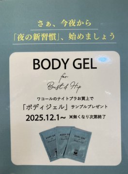 12/1〜『ワコール』のナイトブラお買い上げのお客様にボディジェルのサンプルをプレゼントしております🤗