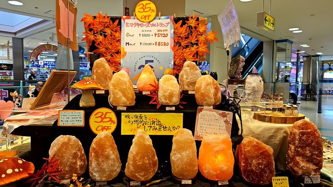3階BeStoneです。ラピア35周年セールFINALとして、11月3日(月)まで「ローズソルトランプ 35%OFF」とかなりお得になっております‼ヒマラヤ岩塩は『空気の浄化作用✨』があるとされ、秋の夜にぴったしな風情ある、あたたかな灯りをお楽しみいただけます。皆様のお越しをお待ちしております☺️