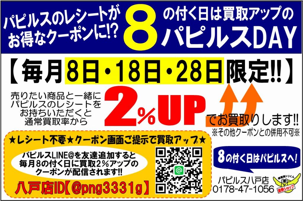 パピルスからお知らせです。 本日11/8(木)8の付く日パピルスDAYでございます♡ これいらないな~現金がいいな~と思っているお客様!! 『パピルスレシートorラインホーム画像』 ご提示だけでお買取率が2%UPです!! ぜひお越しくださいませ♪♪