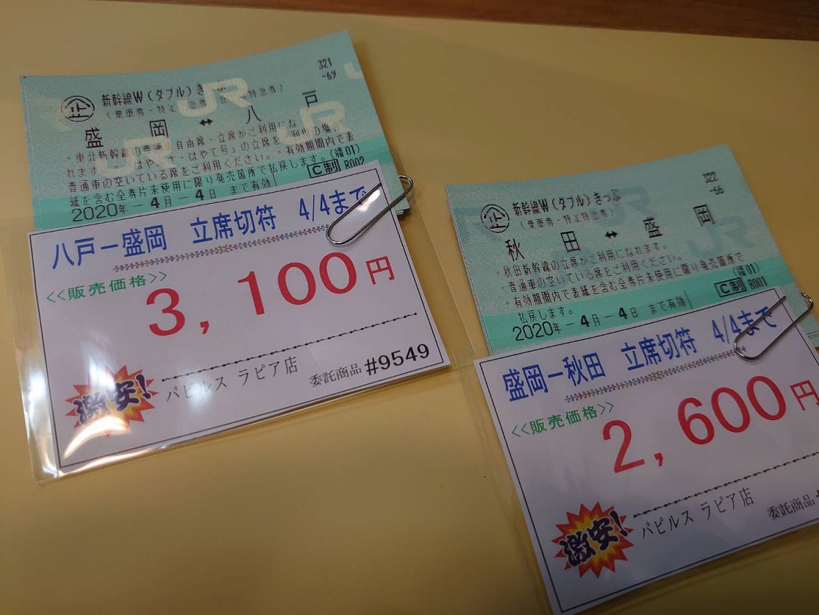 1F パピルス  4月4日まで有効の 新幹線W切符各種入荷しました! 〇【秋田⇔盛岡】2,600円→残り4枚 〇【八戸⇔盛岡】3,100円→残り2枚 八戸→盛岡間が人気ですね☆枚数に限りがございますので、お早めにどうぞ!