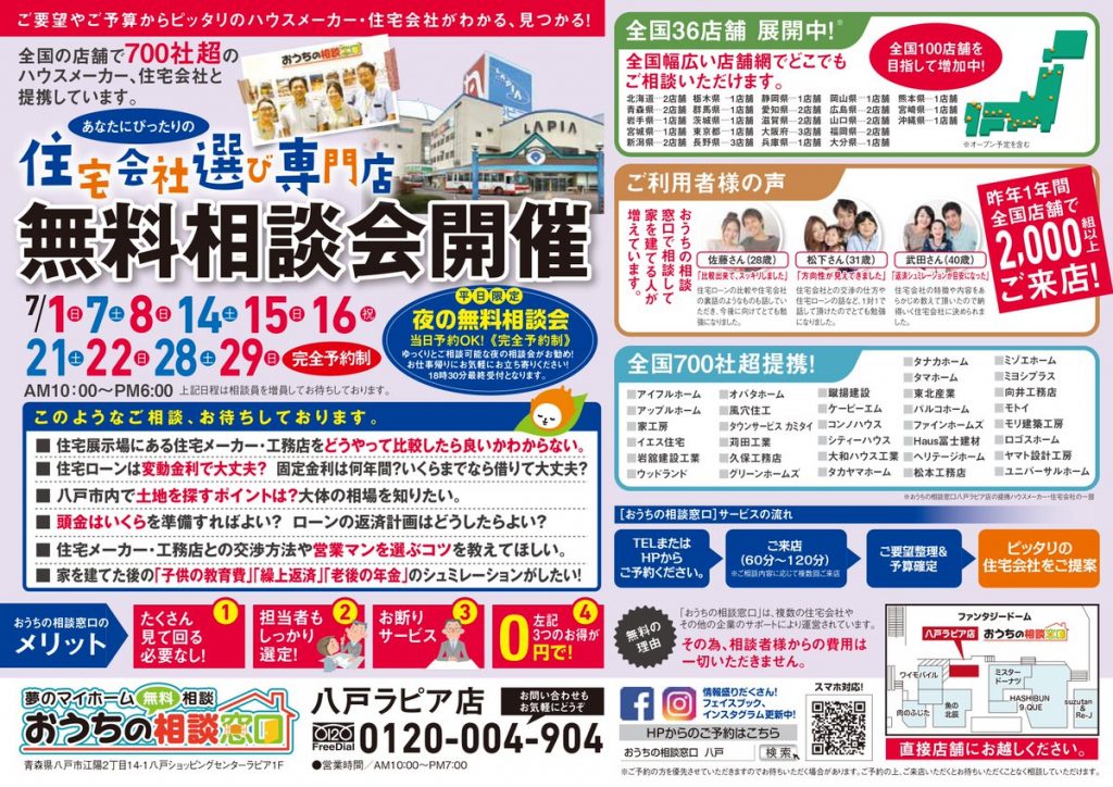 1階おうちの相談窓口です。 7/14(土)からの3日間 『無料相談会』を開催します! おうちづくりに関する悩みや疑問に アドバイザーが丁寧にお答えします。 ご予約いただくと待ち時間がなくスムーズです。 お気軽にお問い合わせください。
